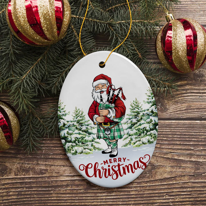 Add a touch of heritage to your celebrations with the Erskine Green Tartan Ceramic Ornament Santa. Featuring a festive Scottish Santa Claus Bagpipe design, this ornament is the perfect keepsake for decorating your home or gifting to loved ones.