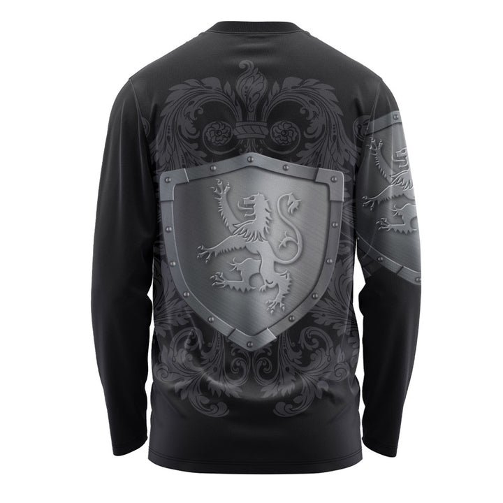 Scotland Long Sleeve T-Shirt Medieval Warrior with Steel Gauntlet Holding Sword and Shield Lion